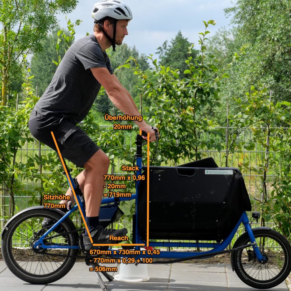 Aus diesen Werten kann man nun alle optimalen Rahmenwerte genau bestimmen. Sprich: Stack+ und Reach+ (als Werte, wie sie bis zur Hand am Lenker gedacht sind und nicht nur bis zum Rahmen-Ende). Entsprechend ist mein Rad dann optimal eingestellt.