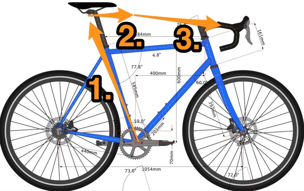 Nach dem Sattel geht es in Richtung Lenker. Nun wird es komplizierter, da man hier auch die Ansprüche an die Haltung stellt. Es kommt auf den Winkel an, wie flach oder aufrecht ihr unterwegs sein möchtet. Daraus ergibt sich eine gewisse Reichweite von-bis für die Entfernen zum Tretlager und Sattel. Dazu gleich mehr.
