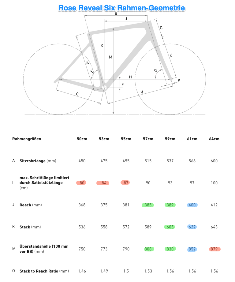 Alle anderen Größen 57, 59 und 61 sind möglich. Reach und Stack sind bis zum Rahmen angegeben. Beim Reach kommen ca 100mm durch den Vorbau und nochmal 110mm durch den Lenker dazu. Auf die sehr sportlichen 644mm komme ich aber trotzdem nicht ganz, mit keinem der Rahmen. Dann wäre ein extra langer Vorbau nötig. Aber eventuell sollte ich mir die sportliche Ambition mit dem Haltungsfaktor von 0,55 noch einmal genau überlegen.