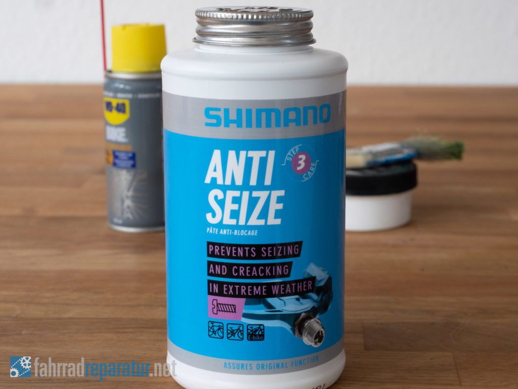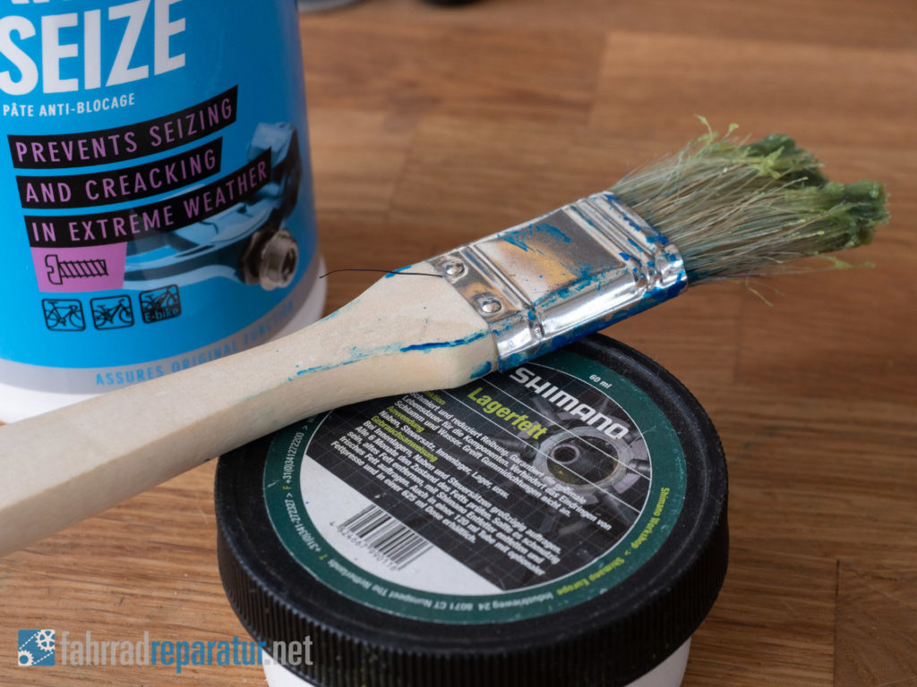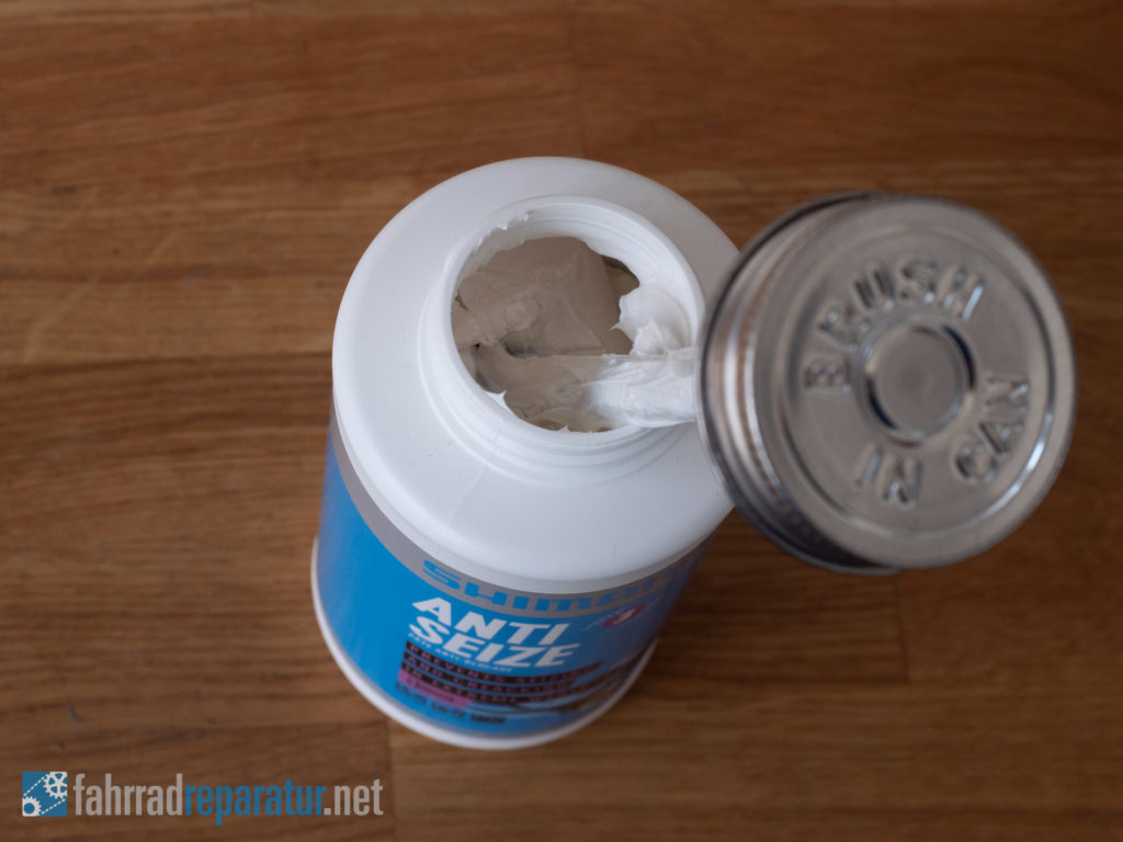 Shimano und alle Komponentenhersteller haben eine eigene „Special-Sauce“. Jedoch ist das Grundprinzip immer gleich: das Fett verhindert, dass sich Wasser direkt auf das Metall setzt und stehen bleibt. Da es deutlich „dicker“ ist und durch Wasser nicht verdrängt wird. Es ist also erst Mal wichtig, dass es Fett ist und nicht immer ein ganz spezielles sein muss. Im Bild oben verwende ich beispielsweise ein Shimano „Lagerfett“, welches speziell für Lager entwickelt wurde. Es tut sein Werk an Schraubverbindungen aber genau so gut.