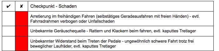 Rot markierte (kritische) Punkte sollten bei Nichterfüllen auch zum Nichtkauf führen. Da das gebrauchte Fahrrad evtl. ein Risiko birgt das man als Laie nicht abschätzen kann. Bei den weniger kritischen Punkten kann man mit einer einfachen Reparatur den Fehler beheben. Diese Kosten haben wir bei Rapartur vom Fachmechaniker grob geschätzt. Damit könnt ihr in der Verhandlung besser einschätzen welchen Puffer ihr benötigt um auf einen reellen Endpreis zu kommen.