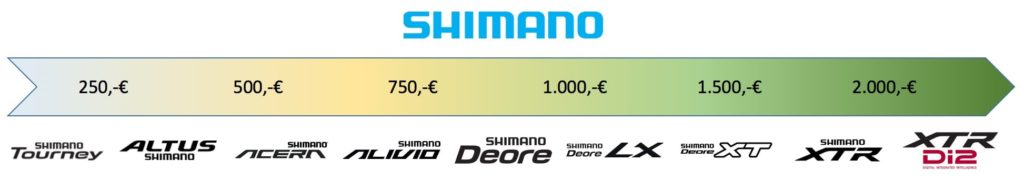 Shimano Tourney, Altus, Acera, Alivio, Deore, LX, XT, XTR und XTR Di2 (elektrische Schaltung, high end).