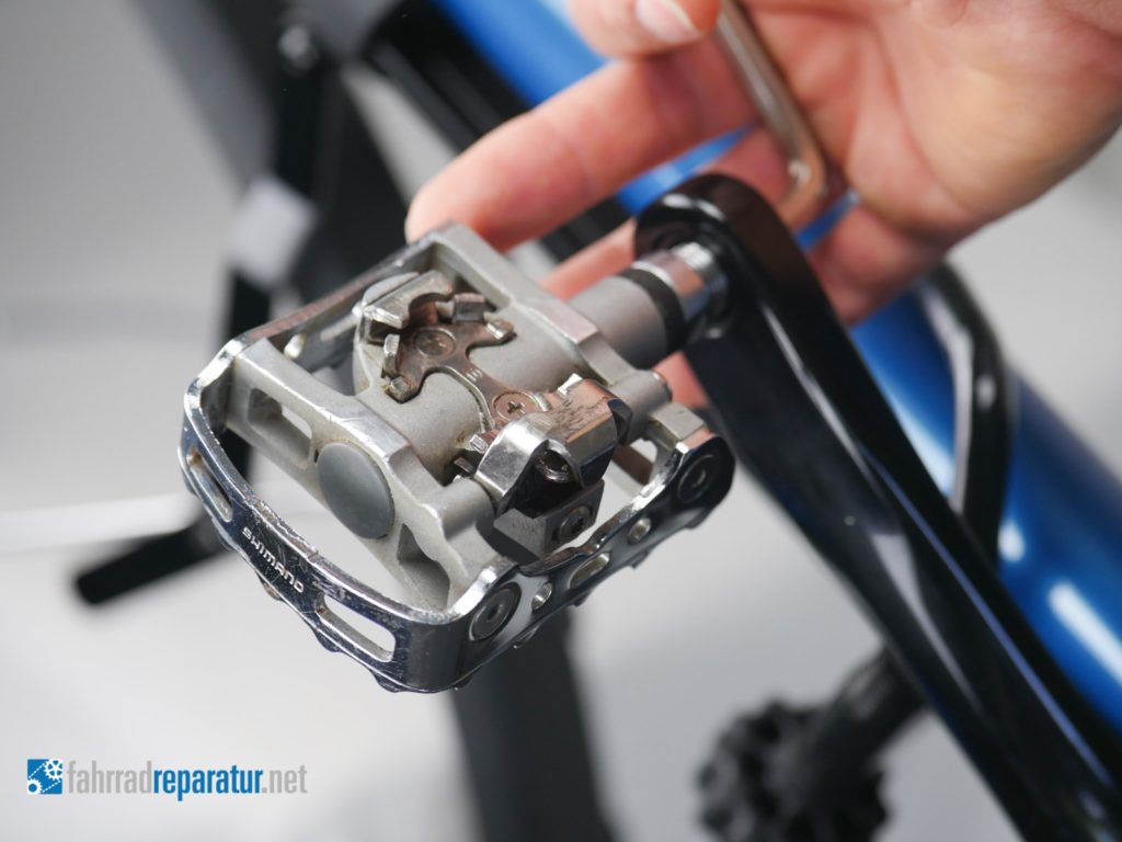- Schraubt die Pedale aus den Kurbeln. Vorsicht bei der Montage von Pedalen (Links- und Rechtsgewinde). Entfettet und säubert das Innen- und Außengewinde. Fettet das Gewinde ein und verschraubt die Pedale mit dem vorgeschriebenen Drehmoment.