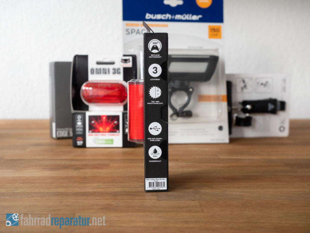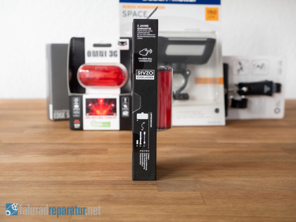 Noch in der Verpackung kann man den Ein-Aus-Taster erreichen. Drückt man diesen wird man direkt geblendet. Denn das Licht dieser LED Rückleuchte ist extrem grell. Der erste Eindruck ist positiv. Und ein wenig negativ, ich mag mein Augenlicht eigentlich.