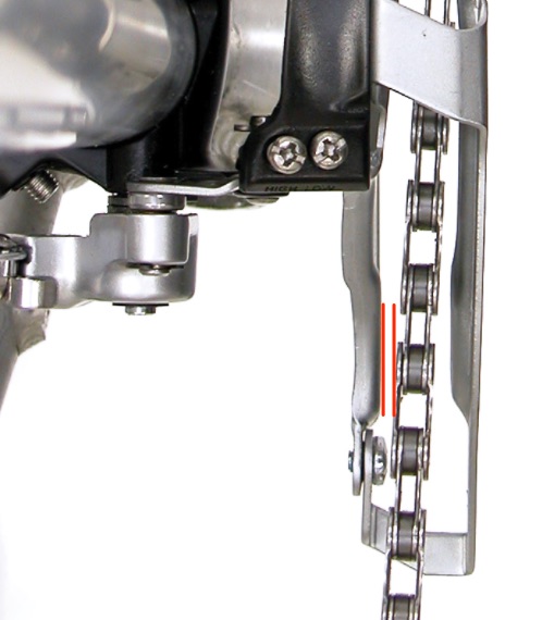 Ziel ist den Abstand auf 0,1 – 0,5mm bekommen. Der Abstand wird zwischen der Kette und dem inneren Plättchens des Umwerfer-Käfigs gemessen. Gemeint ist die Seite des Umwerfer-Käfigs, welche beim Hochschalten die Kette nach „oben“ auf das größere Kettenblatt führen würde. Der Abstand hier muss so klein wie möglich sein (<0,5mm).