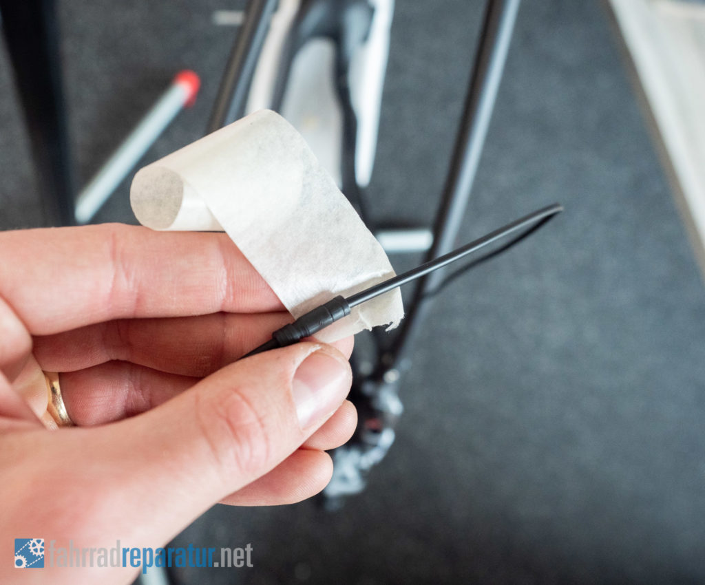 Neben dem Bremskabel geht auch ein Di2 E-Tube zum Lenker. Beide sind in einem Schrumpfschlauch untergebracht, damit das Di2 Kabel praktisch unsichtbar ist.